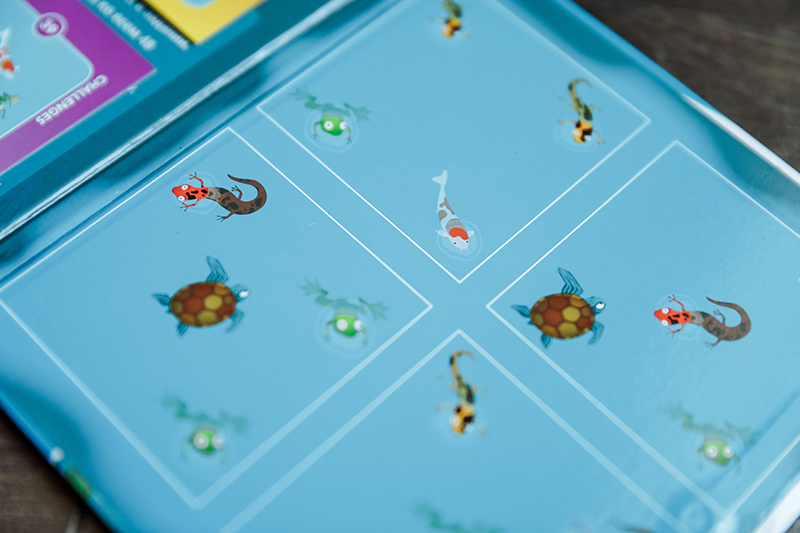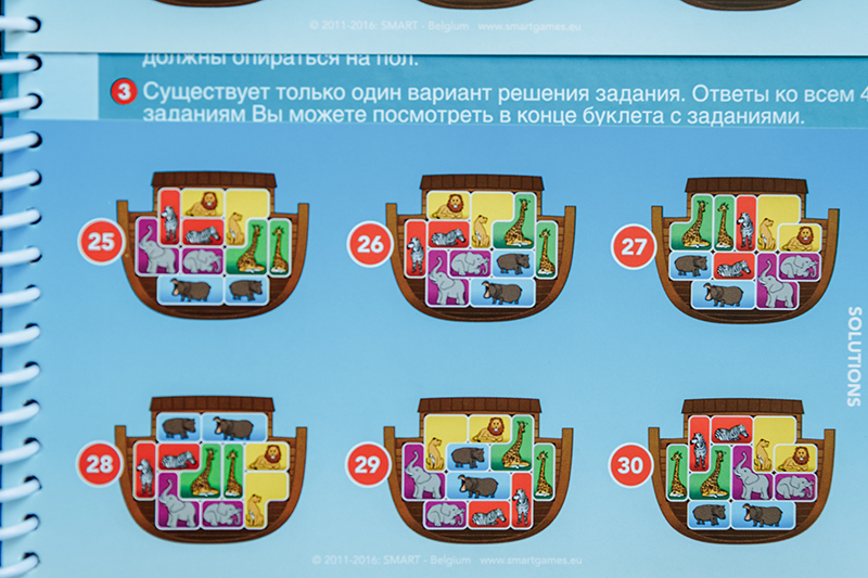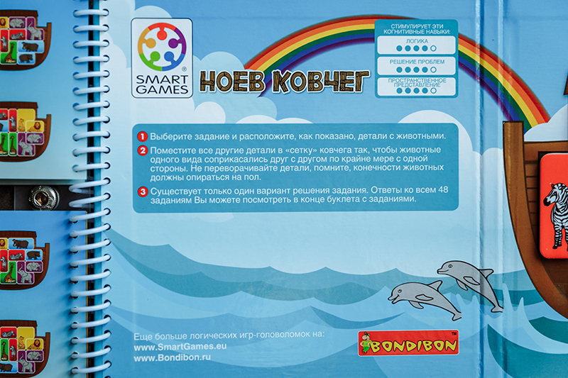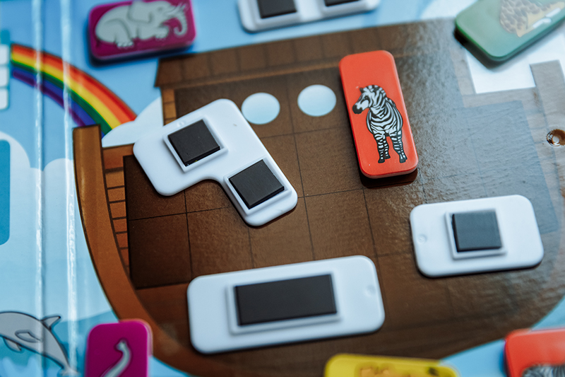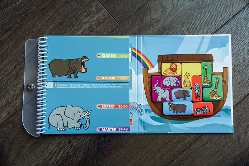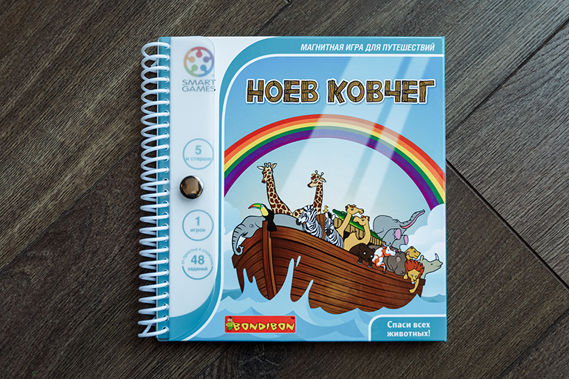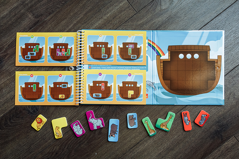 3. «Ноев ковчег» для деток 5+. Тут нужно помочь животным занять свое место в спасительном ковчеге, но не забываем, что пары нельзя разрывать (лев рядом со львицей, жираф рядом с жирафом и т.д.), и все животные должны стоять на лапах (вниз головой нельзя). Единственная игра из наших экземпляров, где есть маленькие непрокрасы. Если сравнивать, в «Ноевом ковчеге» самые мелкие магнитные детали, и сами магниты держатся слабее всех. Но в целом графика очень приятная, само задание интересное.