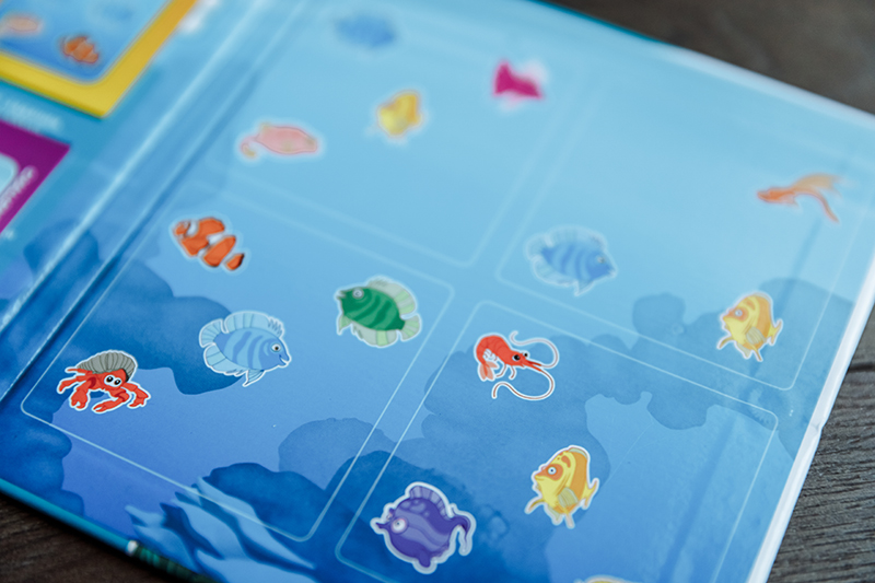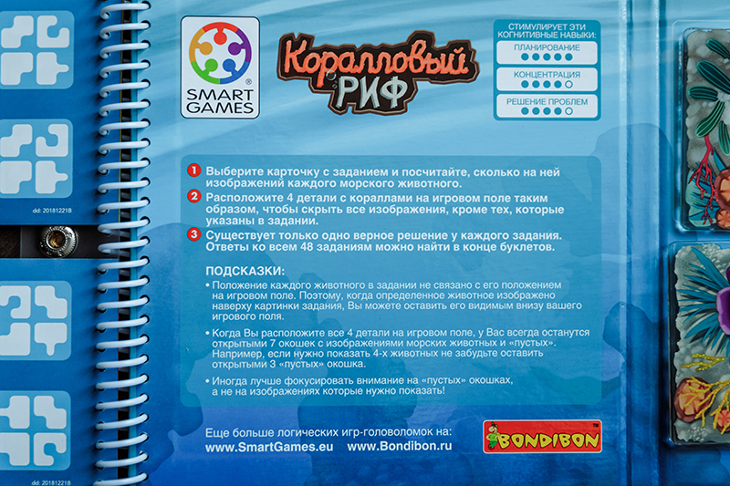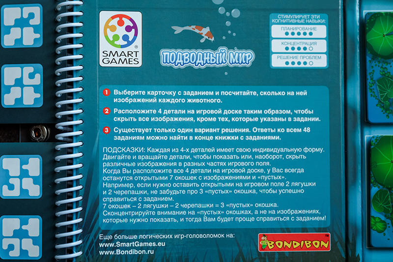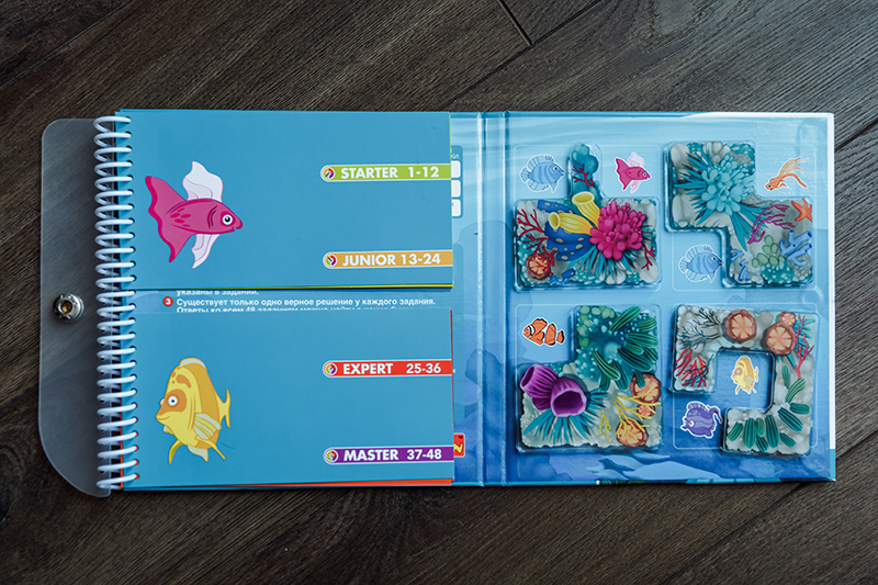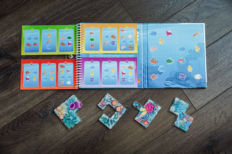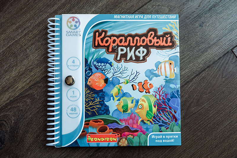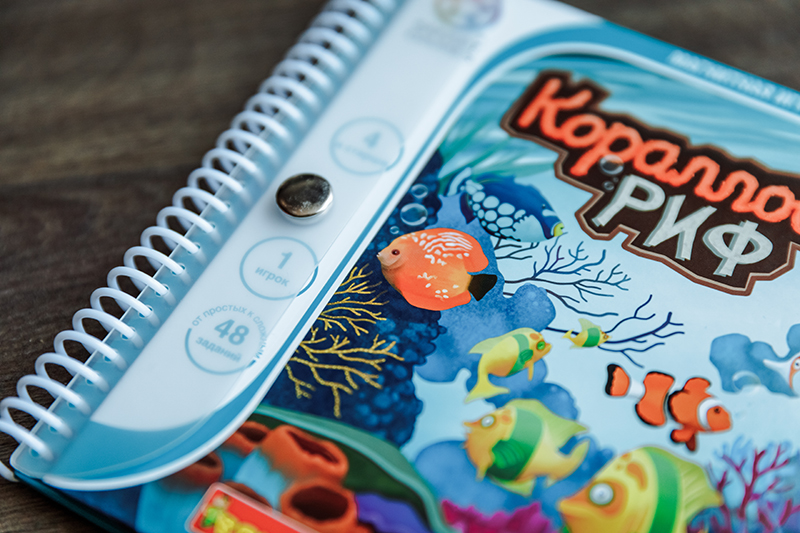 1. «Коралловый риф» для деток 4+ и «Подводный мир» для деток 5+. Магниты на игровом поле нужно поместить таким образом, чтобы остались видны только те подводные жители, которые указаны в задании, а остальных спрятать. Из этой серии у Bondibon есть еще «Деловые жуки» 7+, но графическое оформление в «Жуках» мне нравится не очень.