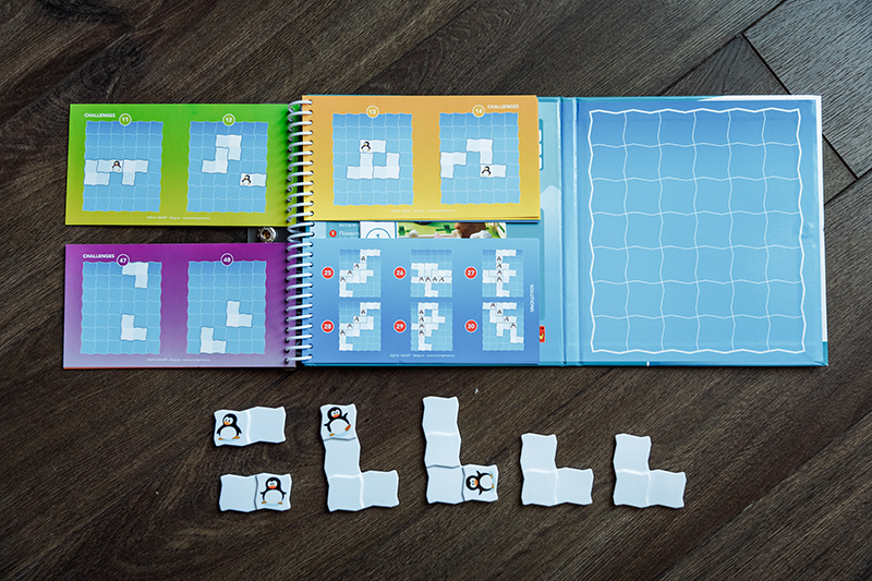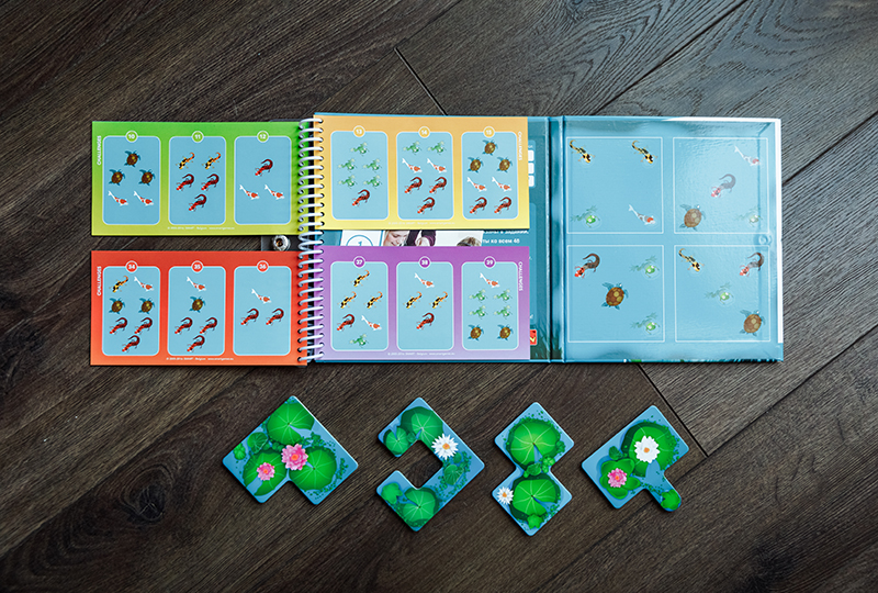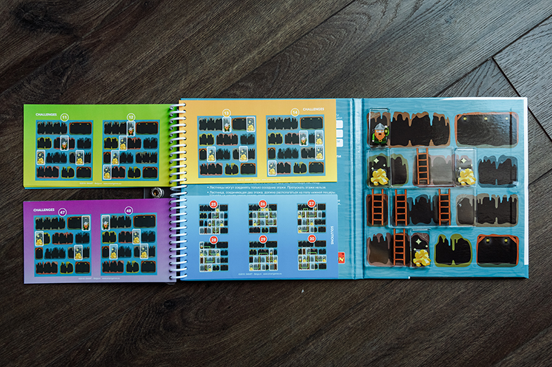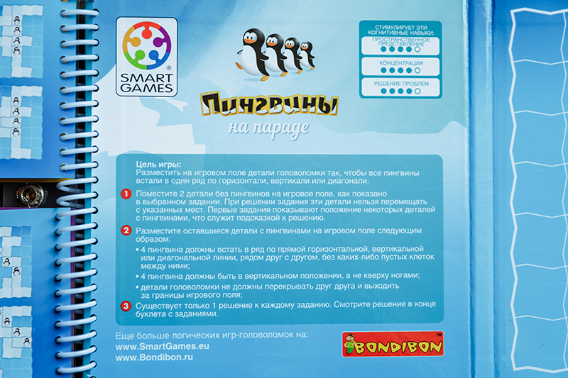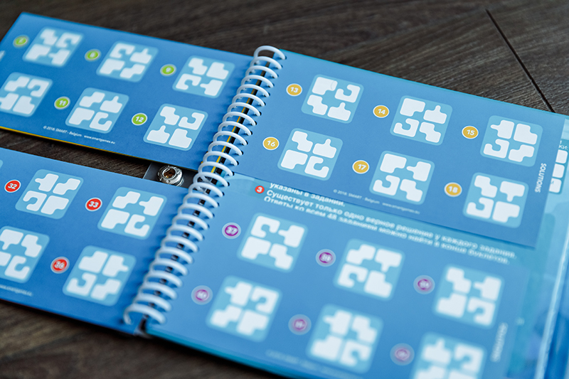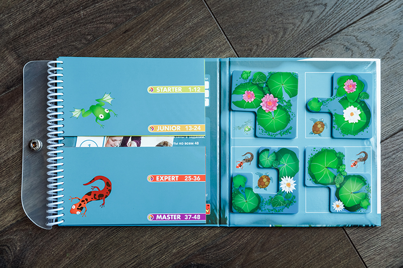 Все игры представляют собой маленький блокнот с твердым переплётом и на пружинке. Одна часть переплета магнитная, на ней собственно и держатся магнитные детали. Слева задания четырех уровней сложности, в конце можно найти и правильные ответы. Каждое задание имеет одно правильное решение. Все это дело закрывается и фиксируется на кнопку, в сложенном состоянии имеет размер 16х16х1 см. Все игры выполнены очень качественно, добротно, очень приятно держать в руках.