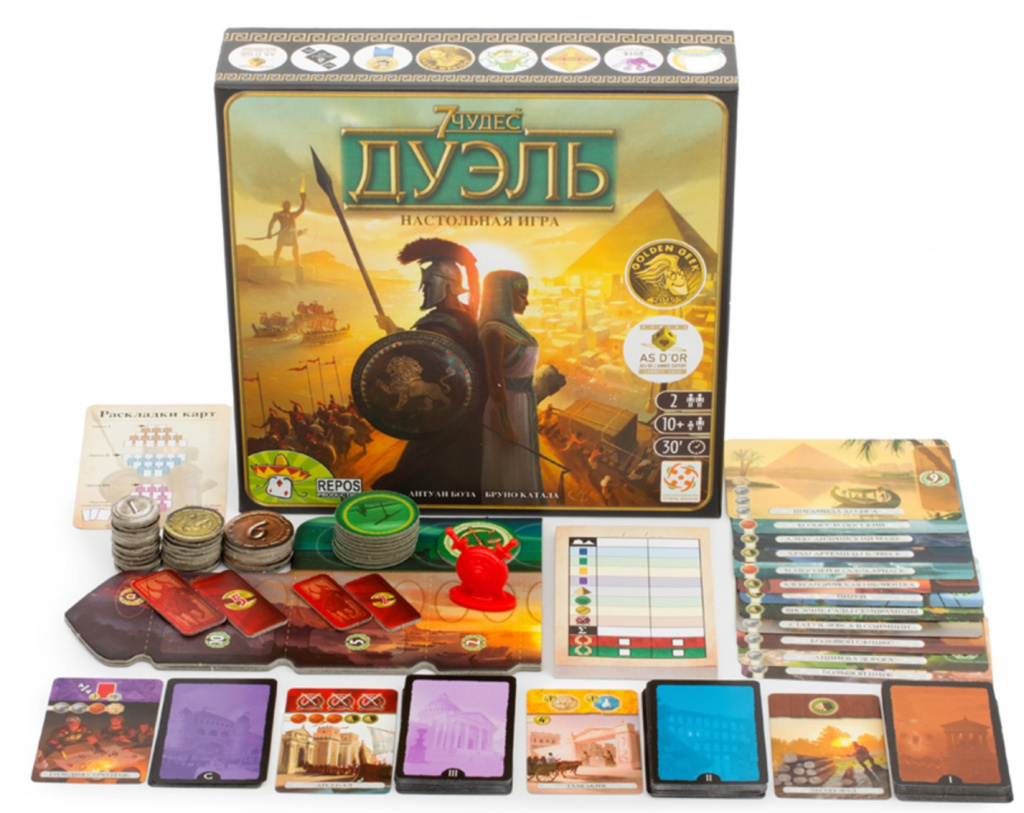 Мне кажется, что 7 Чудес: Дуэль – один из лучших вариантов настольной игры для двоих. Она элегантна во всех аспектах и прекрасно подходит как для приятного вечера, так и для турнирных баталий. А если захочется еще больше сложных и мучительных решений – то Дополнение к игре 7 Чудес Дуэль: Пантеон прекрасно закроет эти потребности. Новые типы карт, чудеса и технологии в сочетании с возможностями изменять порядок хода откроют для вас несметное число новых стратегий.