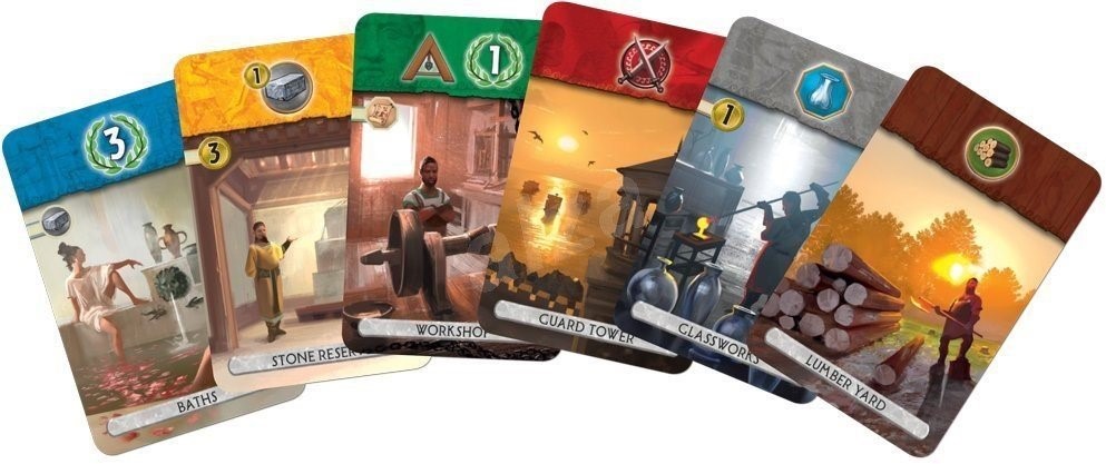 Карты бывают разных типов, одни приносят вам ресурсы, другие позволяют их дешево покупать. Некоторые карты развивают вашу науку, некоторые военную мощь, а некоторые приносят победные очки, символизируя культурный рост цивилизации.