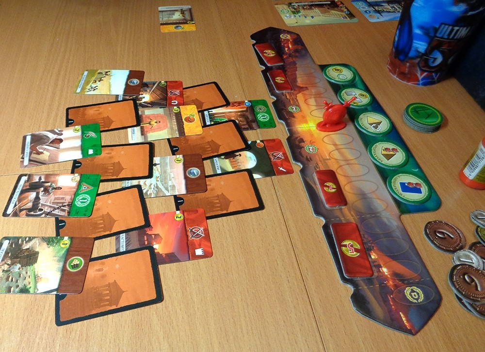 Как вы видите карты лежат внахлест и блокируют друг друга. Игроки по очереди берут по одной из доступных карт и могут использовать их для того, чтобы добавить здание к своему городу (если они располагают ресурсами оплатить ее), построить чудо света или продать карту за монеты, подкопив деньги на будущее.