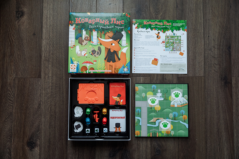 «Коварный Лис» - детективная кооперативная игра для 2-4 игроков старше 5-ти лет, в которой игрокам предстоит выяснить, какой именно Лис украл и съел пирог.