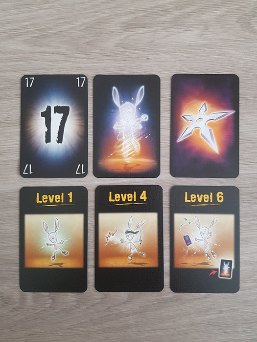 В компактной коробочке вы найдёте колоду карт, пронумерованных от 1 до 100, карты уровней и жизней. Кроме того, у игроков есть специальные карты-бонусы - сюрикены, которые позволяют одновременно каждому сбросить наименьшую карту из имеющихся на руке. Это не только позволяет избавится от части карт, но и даёт подсказку о картах других игроков.