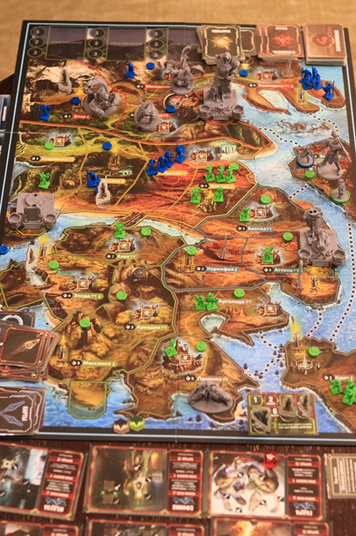 Совсем коротко пройдусь по правилам. В начале игры игроки выбирают себе героев и войска. Герои имеют различные стартовые и игровые свойства. Войска отличаются только цветом и внешним видом (мне больше всего нравятся желтые с большими прямоугольными щитами), игровые свойства у всех одинаковые. Потом, начиная с последнего игрока, по очереди все выставляют своих героев и двух гоплитов на карту. Каждый игрок в свой ход может выполнить вначале обычные действия: использование артефакта, перемещение героя, перемещение гоплитов и отправка на молитву жреца. Обычные действия можно выполнить при возможности хоть все в любом порядке, главное не более одного раза. После этого можно выполнить одно особое действие: подготовку героя, вербовку гоплитов в подконтрольных областях с городами и Спартой, марш гоплитами, охоту на чудовище, постройку храма в подконтрольной области (в которой разрешено строительство храмов), захват области в которой находится герой и постройка монумента. При выполнении особого действия его ячейка на планшете войск игрока закрывается. Исключением из этого правила является постройка монумента. При постройке монумента, все игроки сбрасывают жетоны выполненных действий с ячеек особых действий на своих планшетах, потом проходит фаза чудовищ, и они по очереди активируются кубиком, потом проходит фаза событий и на поле может появиться новое чудовище или откроется новое приключение. Таким образом, особое действие постройка монумента, позволяет открыть ячейки особых действий. Забыл еще упомянуть про то, что героя можно отправить на приключение, закончив его передвижение в области с приключением. Приключение имеет три этапа, для каждого этапа герой должен быть подготовлен (либо иметь определенные характеристики, либо иметь определенное число жрецов и т.п.). Герой может быть отправлен сразу хоть на третий этап, если выполняет его условия. Находясь на приключении, герой передвигается по одному этапу за ход. Достигнув третьего этапа, герой завершает приключение и получает определенный бонус.