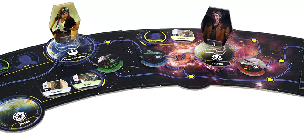 Первое что бросается в глаза - приятная, ненавязчивая атмосфера Star Wars. Я не являюсь ярым фанатом франшизы, но с детства знакомые персонажи, корабли и локации создают ламповую атмосферу. Игра в целом изобилует небольшими историями и моментами, которые погружают вас в авантюрное приключение в далекой далекой галактике. Чубакка с радостью вновь присоединится к команде Хана Соло, империя снова будет строить свои планы захватить власть, а Джабба будет использовать вас в своих криминальных целях. Вы можете доставлять контрабандный груз Повстанцам, выкрадывать корабль синдиката, а может будете мстить Империи за старые обиды. Второй интересной находкой мне показалась фаза контактов. Если во многих играх это механическая фаза, то в этой игре вам нужно постоянно решать и расставлять приоритеты. Заявиться ли в логово Хаттов в поисках работы, попробовать выполнить заказ или попробовать найти себе нового члена команды, не зная чем кончится эта встреча. Редки случаи когда у вас нет выбора. Отдельно хочется отметить визуальную часть игры. Великолепное оригинальное поле, красивые и функциональные планшеты персонажей, большие карты доступных кораблей и приятные кастомные кубики - все это позволяет с удовольствием погрузиться в игру. Еще одним плюсом является масштабируемость, игра отлично играется как вдвоем, так и полным столом. Она дарит разные впечатления, на 4х немного ощущается задержка в ожидании своего хода, но конкуренция и взаимодействие между героями выходит на новый уровень.