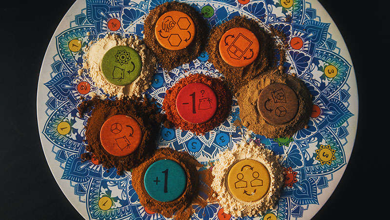 В коробке вы найдёте три двусторонних мандалы с разными рисунками, что позволяет менять игровые условия от партии к партии, и мини-дополнение с жетонами специй, которые дают дополнительные полезные эффекты.