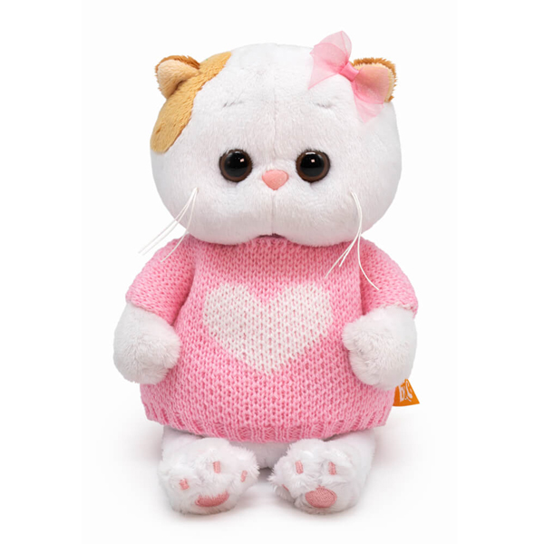 Малышка Ли-Ли в удлиненном вязаном свитере цвета розовой карамели. Свитер спереди украшен вывязанным сердечком. На ушке у Ли-Ли милый розовый бантик из капроновой ленты.