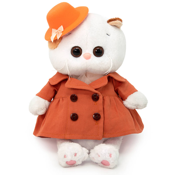 Ли-Ли в очень стильном комплекте в оранжевых оттенках. Двубортный тренч из плотной ткани на четырех пуговках и озорная фетровая шляпка с атласным бантиком.