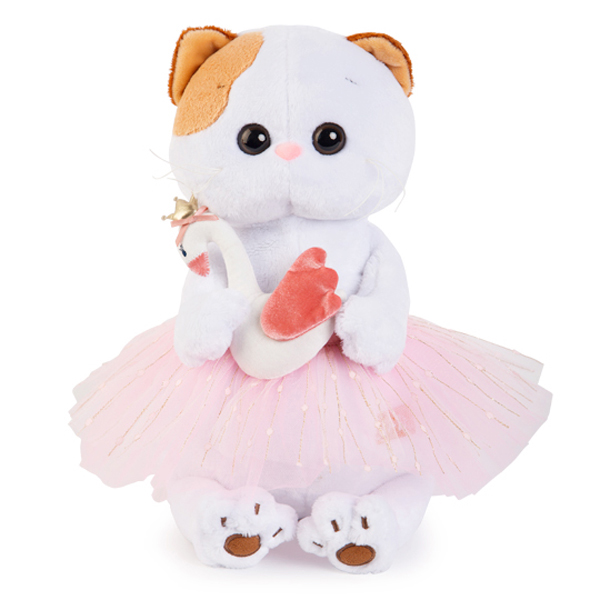 На Ли-Ли пышная юбочка с золотистым люрексом. Юбочка сшита из нескольких слоев нежной сеточки цвета розовой воды на розовом шелковистом пояске. В лапках Ли‑Ли держит милую игрушку — белого лебедя в золотой короне с бантиком и с розовыми крыльями. Игрушка выполнена вручную из бархатистого софта.