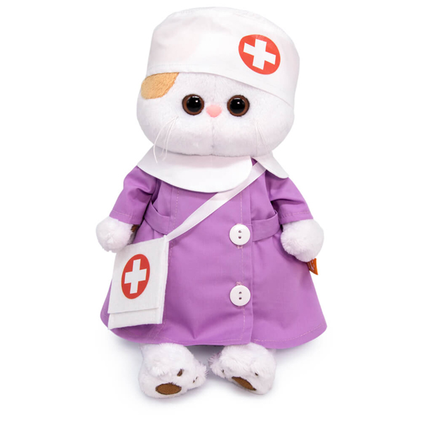 На Ли‑Ли костюмчик доктора. Хлопковый халат лавандового цвета интересного кроя, с белоснежным воротничком и пуговками. В комплекте белый докторский колпачок и сумочка с алым крестом.