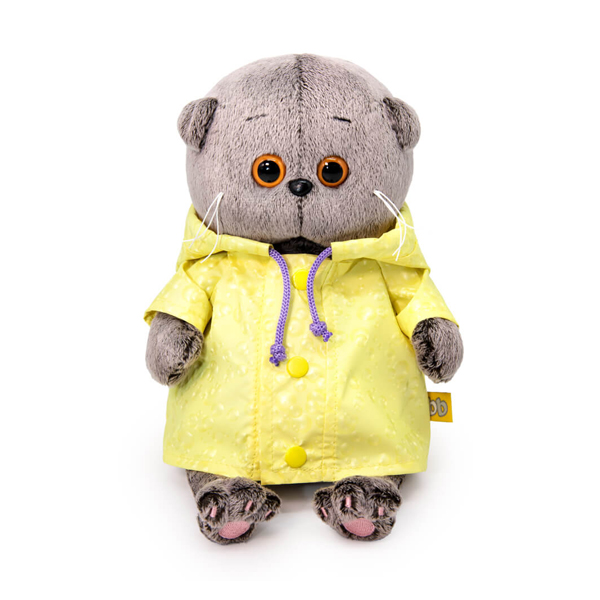 Малыш Басик в стильном дождевике лимонного цвета из непромокаемой ткани с выработкой. Дождевик с капюшоном, который можно затянуть сиреневым шнурком. Спереди на дождевике планка с застежкой на желтые кнопки.