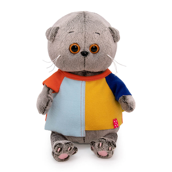 Малыш Басик в забавной разноцветной футболочке, с декоративным швом и лейбачком из тесьмы в горошек.