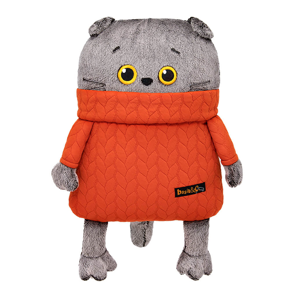 Необычная подушка кот Басик из оригинального меха с вышитой мордочкой. На коте‑подушке вшит интересный свитер с высоким воротником стойка. Оранжевый свитер из плотной мягкой ткани с выработкой под вязку косами. Внизу на подушке пришит фирменный логотип.