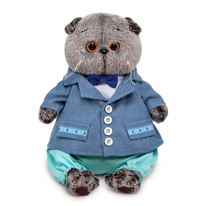 Кот в непринужденном комплекте. Пиджак сшит из очень мягкого микровельвета цвета голубой дали, застегивается на серебристые пуговки, а на листочках забавная тесьма с якорями. В комплекте бирюзовые широкие штанишки на резиночках. Также в комплекте белая маечка из
