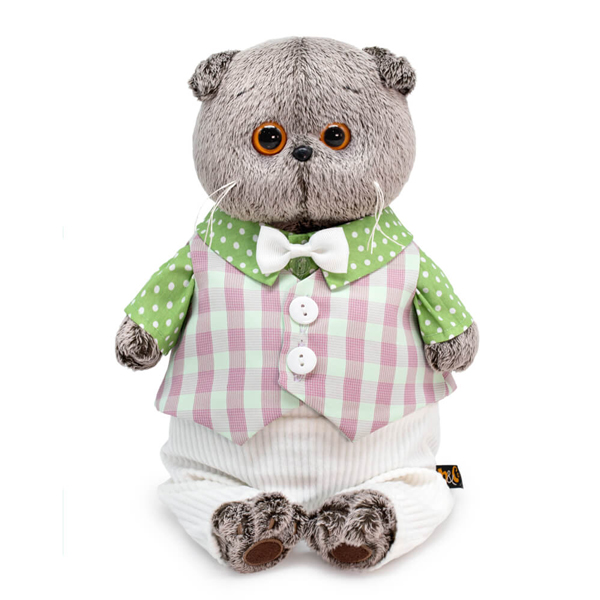 Кот Басик в невероятно красивом костюмчике в светлых тонах. Костюмчик можно надеть для встречи гостей, например, у себя на даче. Неспешно выпить вкусного чая за милой беседой. В комплекте: вельветовые белые брючки, зеленая хлопковая рубашечка в белый горошек и жилет в клеточку на белых пуговицах. А также неизменная бабочка из кипенно‑белой сутажной ленты.