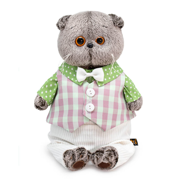 Кот Басик в невероятно красивом костюмчике в светлых тонах. Костюмчик можно надеть для встречи гостей, например, у себя на даче. Неспешно выпить вкусного чая за милой беседой. В комплекте: вельветовые белые брючки, зеленая хлопковая рубашечка в белый горошек и жилет в клеточку на белых пуговицах. А также неизменная бабочка из кипенно‑белой сутажной ленты.