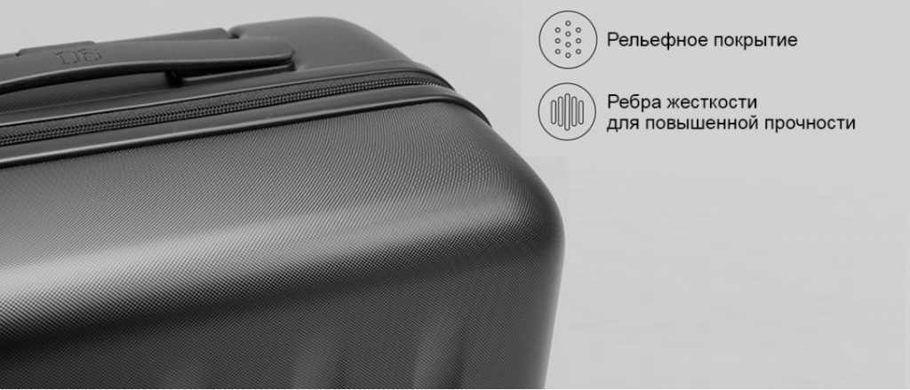 Корпус имеет рельефное покрытие в виде сеточки. Это даёт эффект приглушенного блеска. Благодаря такой фактуре на поверхности чемодана не будут оставаться отпечатки пальцев, царапины и пыль. Также с двух сторон видны фигурные вмятины – это ребра жесткости, которые помогают изделию держать форму и противостоять механическим нагрузкам.
