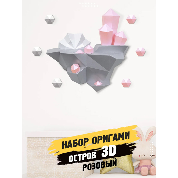 3D-конструктор PAPERRAZ для сборки полигональной модели «ОСТРОВ С КРИСТАЛЛАМИ (розовый)» из дизайнерского картона.