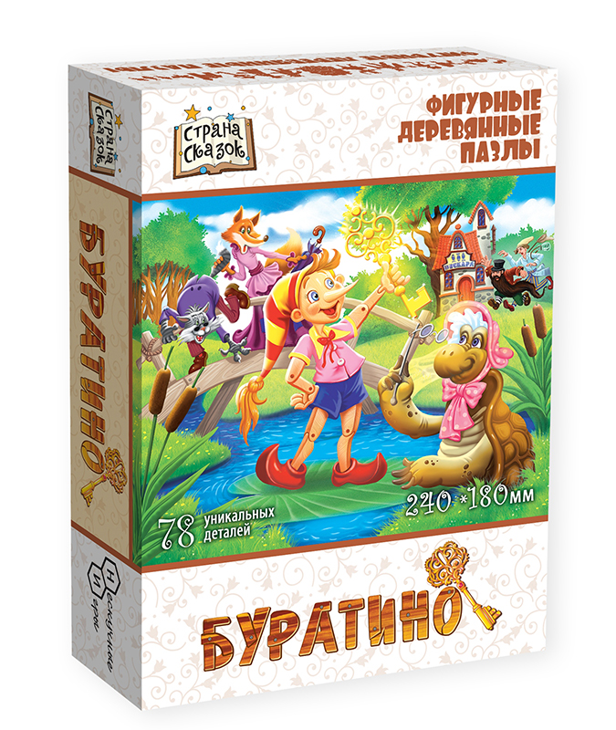 Фигурный пазл отличается от стандартного необычной формой деталей. Кроме того, часть деталей выполнена в форме предметов, связанных с тематикой картинки. В данном случае это герои и предметы, связанные с историей про Буратино. Детали пазла выполнены из фанеры. Рисунок нанесен прямо на дерево с помощью специального принтера, он долговечен и не сотрется даже после многократных сборок. Такой пазл понравится и детям и взрослым, ведь сборка доставляет визуальное и тактильное удовольствие.