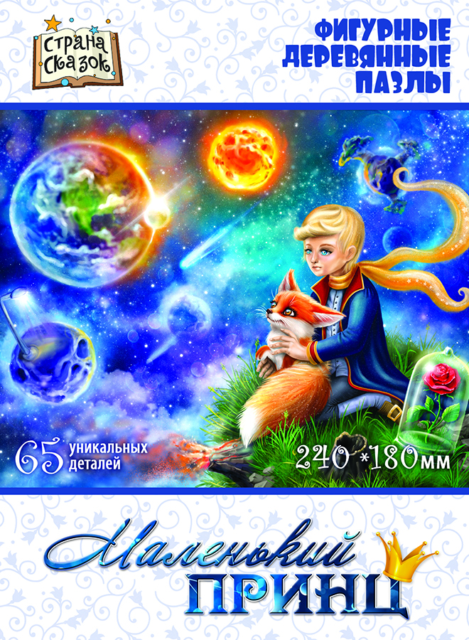 Фигурный пазл отличается от стандартного необычной формой деталей. Кроме того, часть деталей выполнены в форме предметов, связанных с тематикой картинки. В данном случае это герои и предметы, связанные с историей про Маленького принца: роза, лис, барашек, самолет ... Детали пазла выполнены из фанеры. Рисунок нанесен прямо на дерево с помощью специального принтера, он долговечен и не сотрется даже после многократных сборок. Такой пазл понравится и детям и взрослым, ведь сборка доставляет визуальное и тактильное удовольствие.