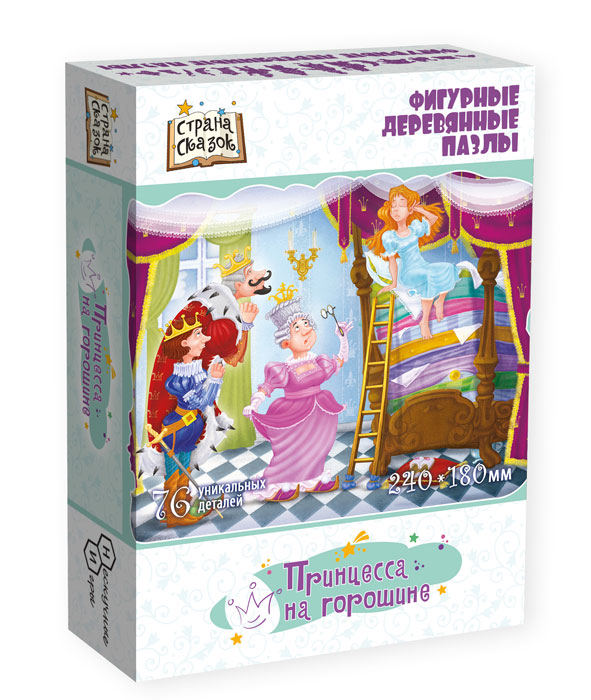 Фигурный пазл отличается от стандартного необычной формой деталей. Кроме того, часть деталей выполнены в форме предметов, связанных с тематикой картинки. В данном случае это герои и предметы, связанные с историей про Принцессу на горошине... Детали пазла выполнены из фанеры. Рисунок нанесен прямо на дерево с помощью специального принтера, он долговечен и не сотрется даже после многократных сборок. Такой пазл понравится и детям, и взрослым, ведь сборка доставляет визуальное и тактильное удовольствие.