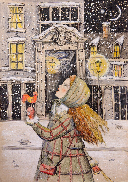 В преддверии Нового года снег становится не только вкусным, но и волшебным. Съедаешь снежинку - и происходит превращение. Только собрав картину, можно увидеть волшебство превращения девочки-героини.