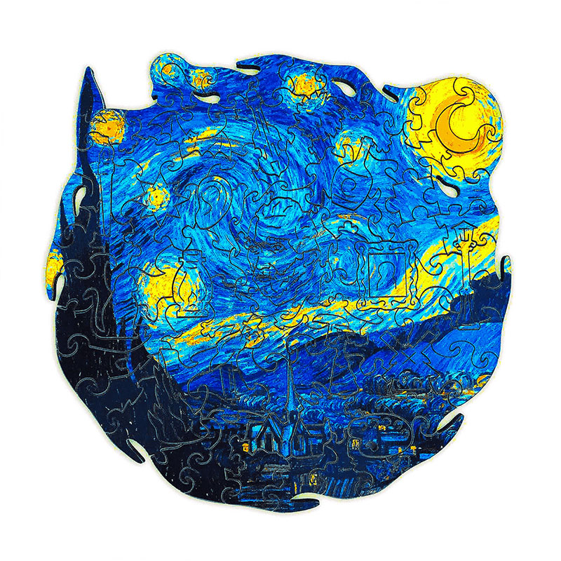 Детали пазла покоряют своей уникальностью. Кроме резных кусочков, стилизованных под мазки кисти Ван Гога, вы найдете целый набор узнаваемых фигурок - мольберт, мельница, дама и джентльмен и даже автопортрет самого художника!