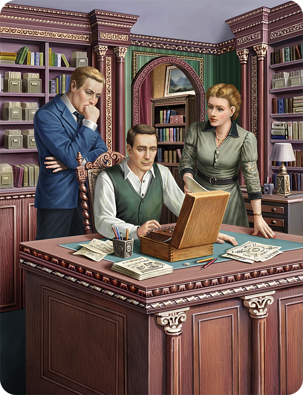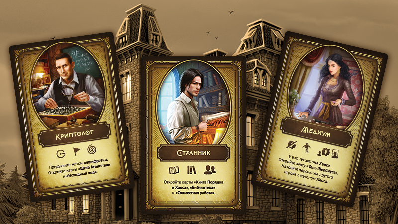 В начале партии каждый игрок получает одну из карточек персонажей, из которых далеко не все настоящие специалисты по шифрованию — остальные виртуозно выдают себя за криптологов. У каждого персонажа есть своя секретная миссия по поиску определённых карт в особняке, набору жетонов или созданию игровых ситуаций.