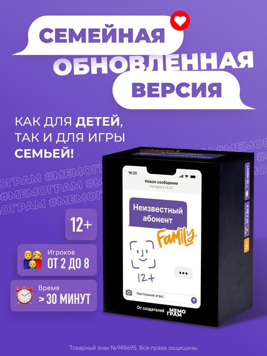 Семейная версия нашумевшей настольной игры для любой компании «Неизвестный абонент Family» – это игра для детей и компании с текстовыми сообщениями, где игроки соревнуются в создании самых смешных комбинаций входящих и исходящих СМС-ок. Соберите все версии игры и веселитесь по полной!