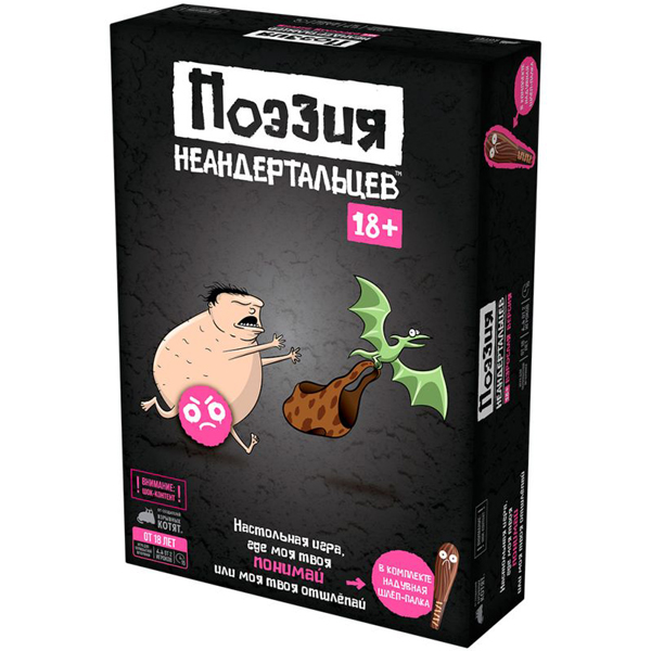 "Поэзия неандертальцев 18+" – это версия весёлой вечериночной игры "Поэзия неандертальцев" (без цифр). Что это значит? Это значит будьте готовы ко всякой первобытной нецензурщине, которую совершенно точно не стоит слышать деткам, зато вполне можно слышать на уже взрослой вечеринке. И не только слышать, но и объяснять! Только обязательно односложными словами, потому что, сами понимаете, речь пещерных людей была невероятно экспрессивная и необычная, но лишённая всяких вот этих дурацких сложностей в виде двух, трёх или и того больше слогов. И если вдруг из вас случайно вырвется человек начитанный вместо человека неандертальского, то будьте готовы схлопотать по маковке шлёп-палкой! И неприятно, и грустно, и очков победных не достанется. Не приведи динозавр, ещё за детский стол отсадят... В общем, сделайте всё, что в ваших силах, чтобы доказать: ваше племя – эксперт по всяким похабным словечкам и с гордостью готово это признать!