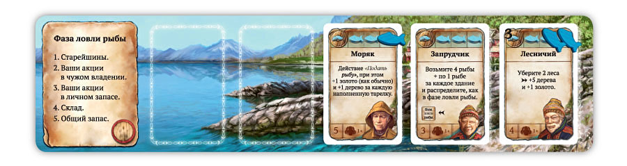 Этой рыбой тут же может воспользоваться следующий игрок, чтобы активировать своего старейшину. Между игроками возникает своего рода симбиоз: один накрывает и получает золото, другой использует это в своих интересах. Кстати, вполне возможно, что накрытой рыбы хватит и вам — для того чтобы на своём ходу тоже задействовать старейшину. Тут важно понять, когда нужно выкладывать, а когда убирать рыбу со стола — не только в своих интересах, но и чтобы вынудить соперника срочно вносить коррективы в свои планы. Как мы уже говорили, уровень взаимодействия в игре довольно высок.