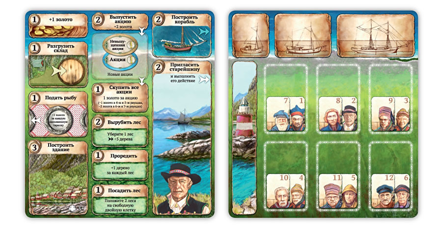 На столе «Нусфьорд» выглядит как несколько разных планшетов, представляющих саму деревню (центральная игровая область) и небольшие рыболовные компании (личная игровая область), которыми и будут управлять игроки.