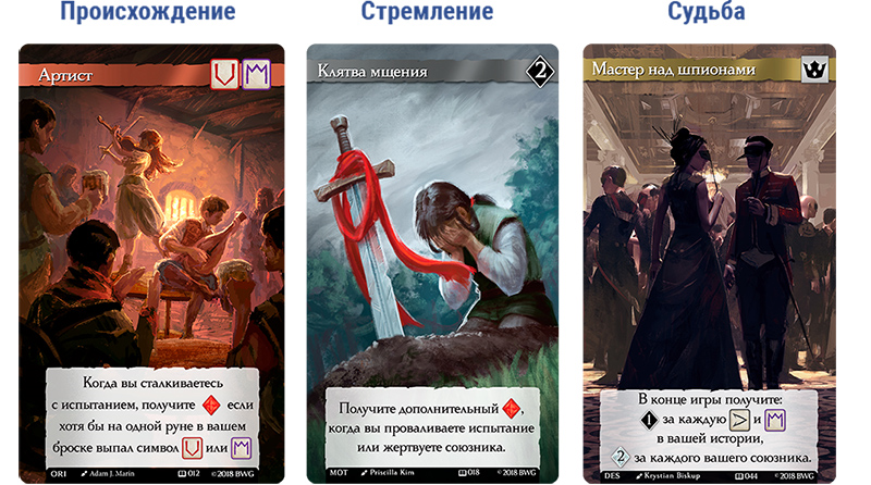 Вы начнете игру с 3 картами, отражающими ваше происхождение, стремление и судьбу. Они положат начало истории вашего героя. А пройденные испытания станут ее новыми главами.​