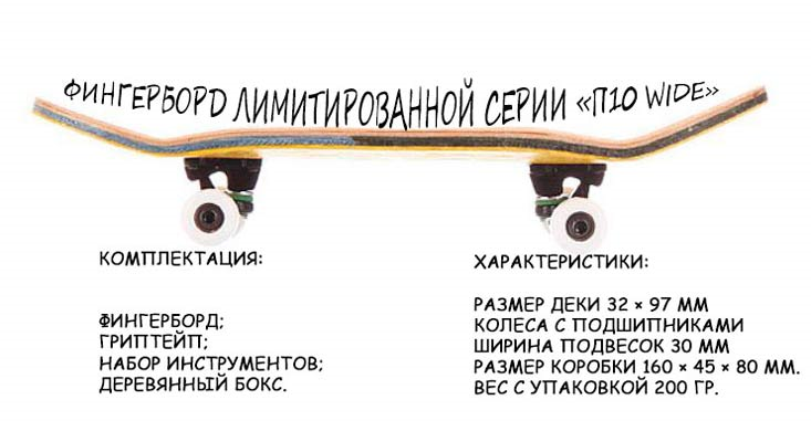 П10 Wide отличается широкой цветной подвеской с «рингами», уникальной шириной деки из пятислойного канадского клёна (32 мм), мягким риптейпом и оригинальной гравировкой, выполненной вручную. Этот фингерборд продаётся в комплекте с риптейпом, классической отвёрткой и шестигранным ключом в подарочном деревянном боксе.