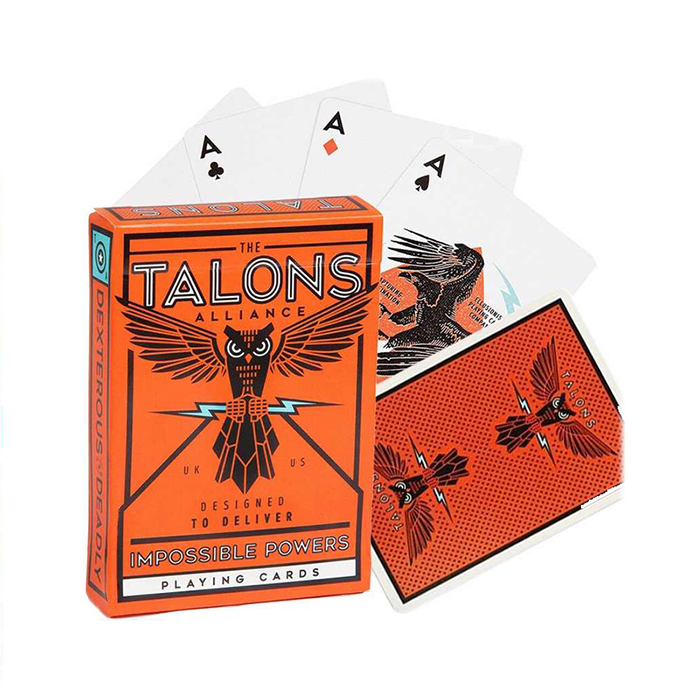 Колода карт Talons – это олицетворение мощи и ловкости в мире магии. На темно-оранжевой рубашке запечатлены в полете совы, ухватившие в когти молнии/