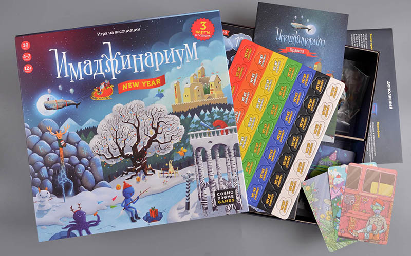 Это подарочное издание Имаджинариума — специально для Нового года. Видите, сколько снега и гирлянд на коробке? А ещё внутри лежат три новых карты в дополнение к основным. Играть очень просто: вы подбираете карту к ассоциации ведущего, а потом угадываете, какая из множества карт — его. За правильную догадку шагаете по полю. Победит тот, кто первым придёт к финишу. Это очень красивая игра на ассоциации. Она будит воображение и нравится практически всем — такая она добрая, простая и залипательная. Подходит для большой компании от 4 до 7 игроков — то есть, самое то для новогодней вечеринки с друзьями или семьёй. Играть можно от 12 лет.