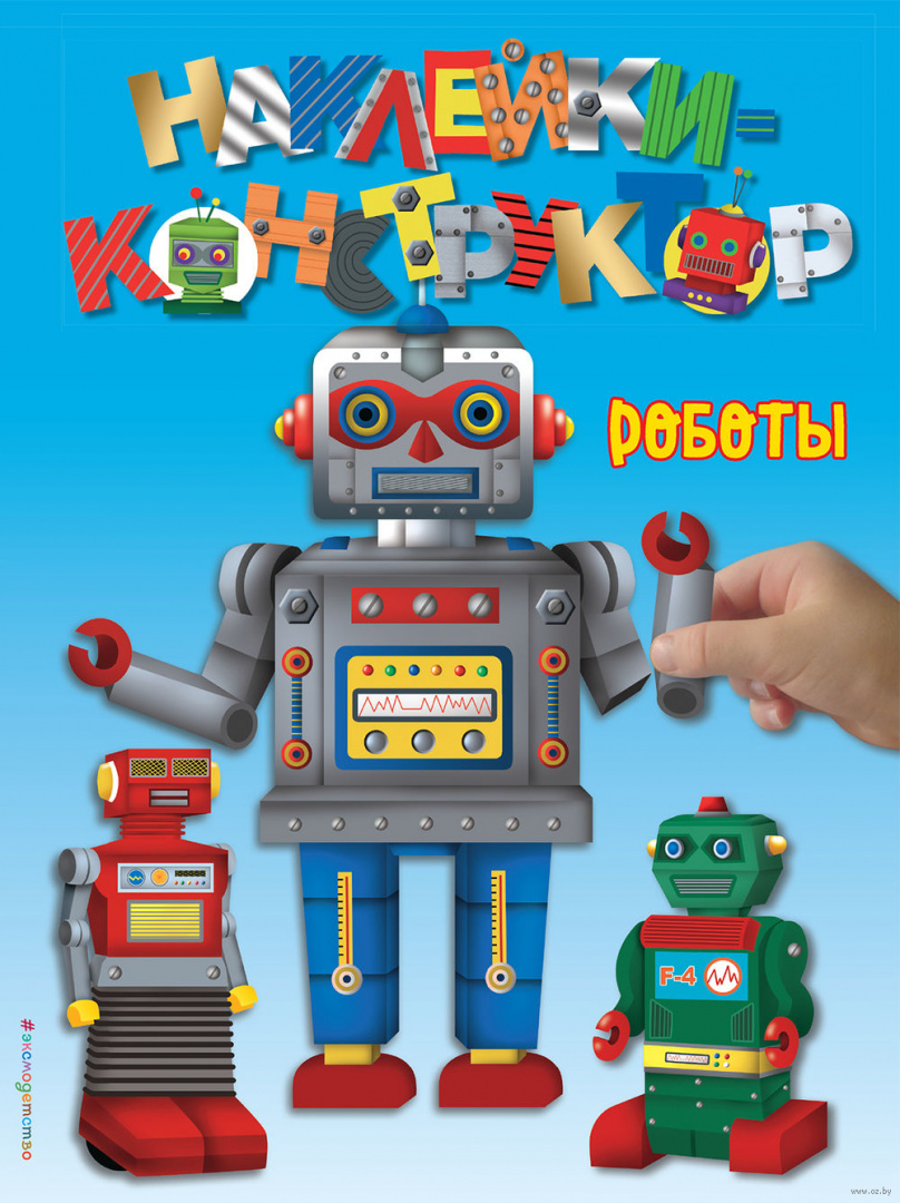 Книга с наклейками "Роботы" вышла в серии "Наклейки-конструктор", а значит, на каждой странице малыша ожидает яркая крупная картинка с каким-нибудь роботом, которого надо "достроить" с помощью наклеек. Помимо этого каждая картинка сопровождается коротким текстом с подстановочным заданием - малыш должен подобрать наклейки к тем словам, где мама при чтении делает паузу и наклеить их на соответствующее место в тексте.