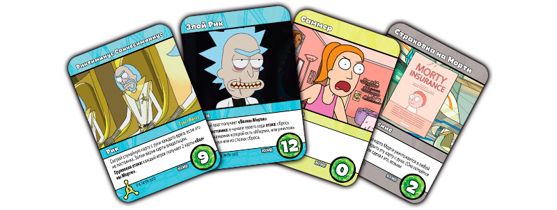 Игроки начинают только со своими волнами гения, но по ходу игры они будут получать новые, более мощные карты в свою колоду. Цель каждого из игроков – победить как можно больше членов Совета Риков (и, конечно же, Злого Рика!).