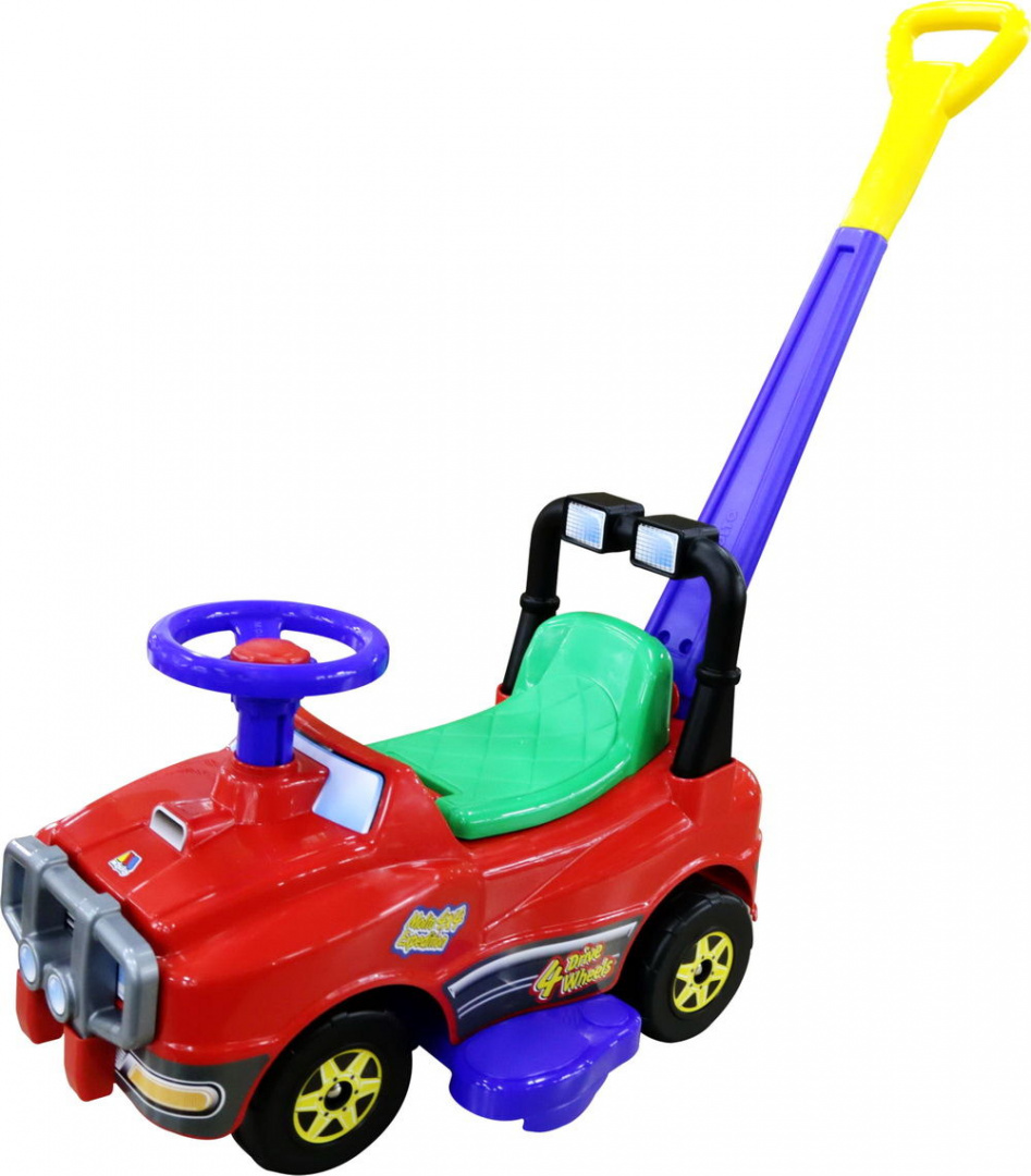Каталка для деток машинка «Джип» с ручкой отлично подойдет, если малыш начинает делать свои первые шаги. На машинке есть удобная регулируемая ручка и можно везти каталку внедорожник перед собой. Малыш удобно устроится на пластиковом сиденье со спинкой, а ножки можно поставить на подножки, находящиеся по бокам машинки.