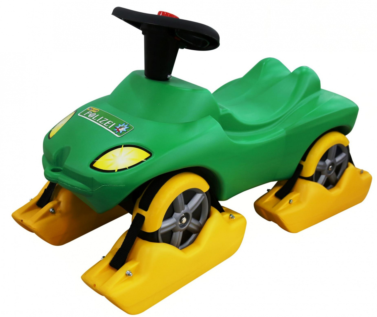 На этой замечательной игрушке Ваш малыш сможет кататься и зимой и летом! Прекрасная машина каталка оснащена съемными лыжами для зимних прогулок.