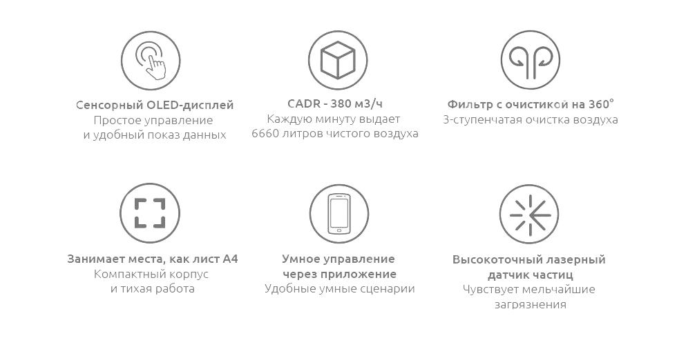 Сенсорный OLED-дисплей позволяет свести все управление очистителем к простым нажатиям. Дисплей четко показывает данные о состоянии воздуха и работе очистителя, а индикаторные кольца быстро сообщают информацию о качестве воздуха в помещении.