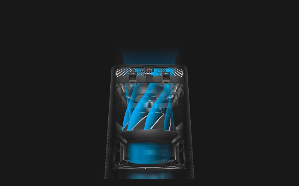Усовершенствованный центробежный вентилятор, мощный бесщеточный двигатель и система воздуховодов обеспечивают высокую мощность всасывания и увеличенную эффективность фильтрации. Увеличенная площадь выдувной решетки способствует быстрому и равномерному распределению чистого воздуха по комнате.
