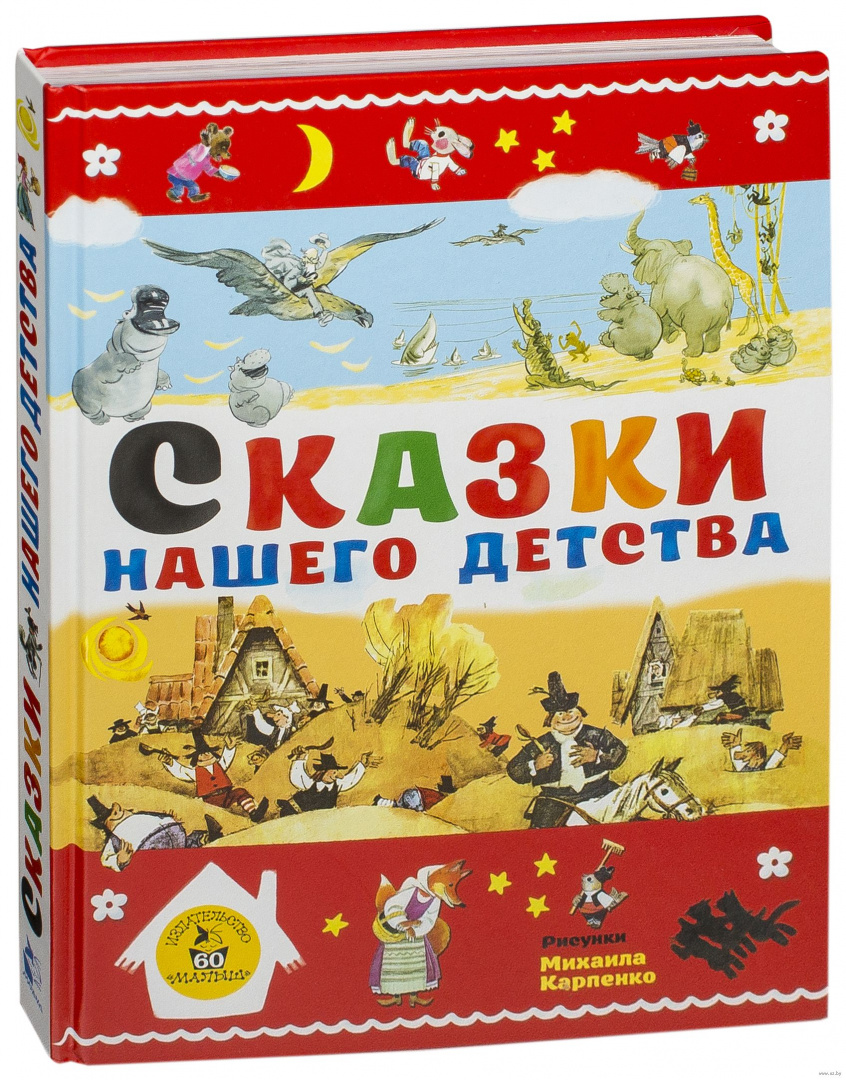 В книгу "Сказки нашего детства" вошли как всем известные сказки "Айболит" К. Чуковского, "Горшок каши" Братьев Гримм в классическом переводе А. Введенского, так и народные "Лиса, заяц и петух", "Собака и волк", "Воробей и лиса" и многие другие. Каждую сказку дополняют яркие, самобытные и интересные иллюстрации народного художника СССР - Михаила Карпенко.
