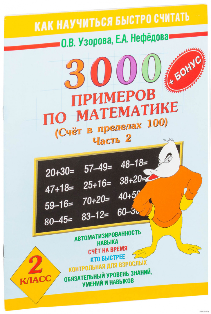 Пособие содержит 3000 математических примеров по теме "Счет в пределах 100". Оригинальное построение материала позволяет обеспечить более глубокое его усвоение.