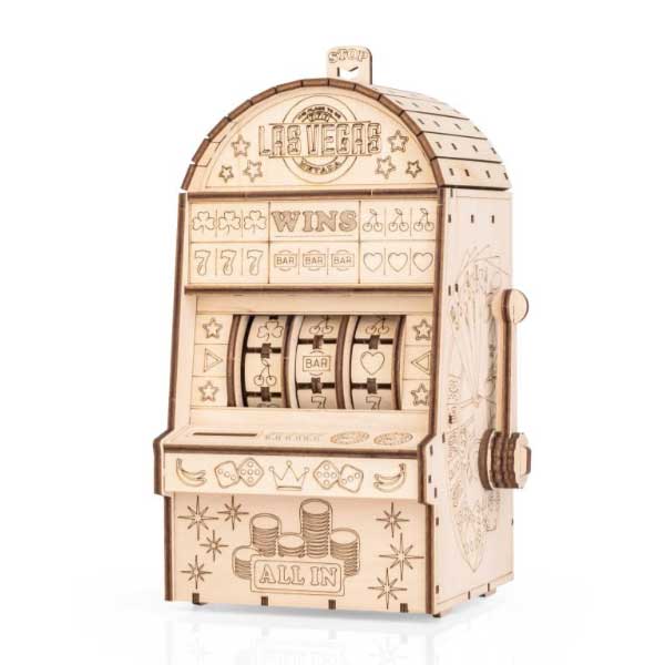 Деревянный механический конструктор «Однорукий бандит» — это оригинальная модель игрового автомата с подвижной механикой. После сборки вы опускаете рычаг, забрасываете монетки, и барабаны начинают вращаться — остаётся дождаться выигрышной комбинации из трёх символов.