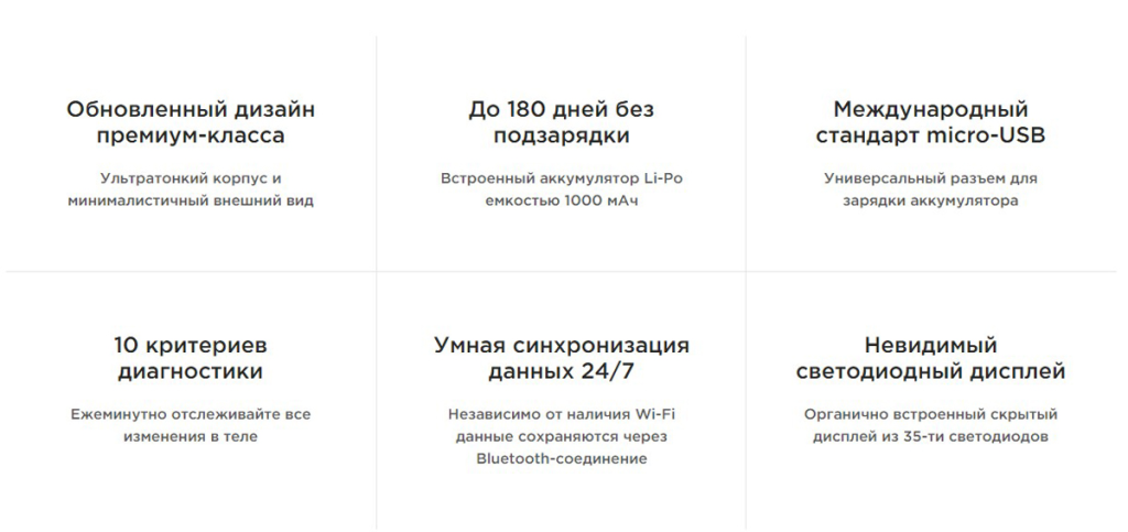 | Функциональные особенности | расчёт доли жировой ткани, расчет доли мышечной ткани, расчет доли костной ткани, расчет ИМТ (BMI), расчет ПБМ (BMR), расчет уровня белка |