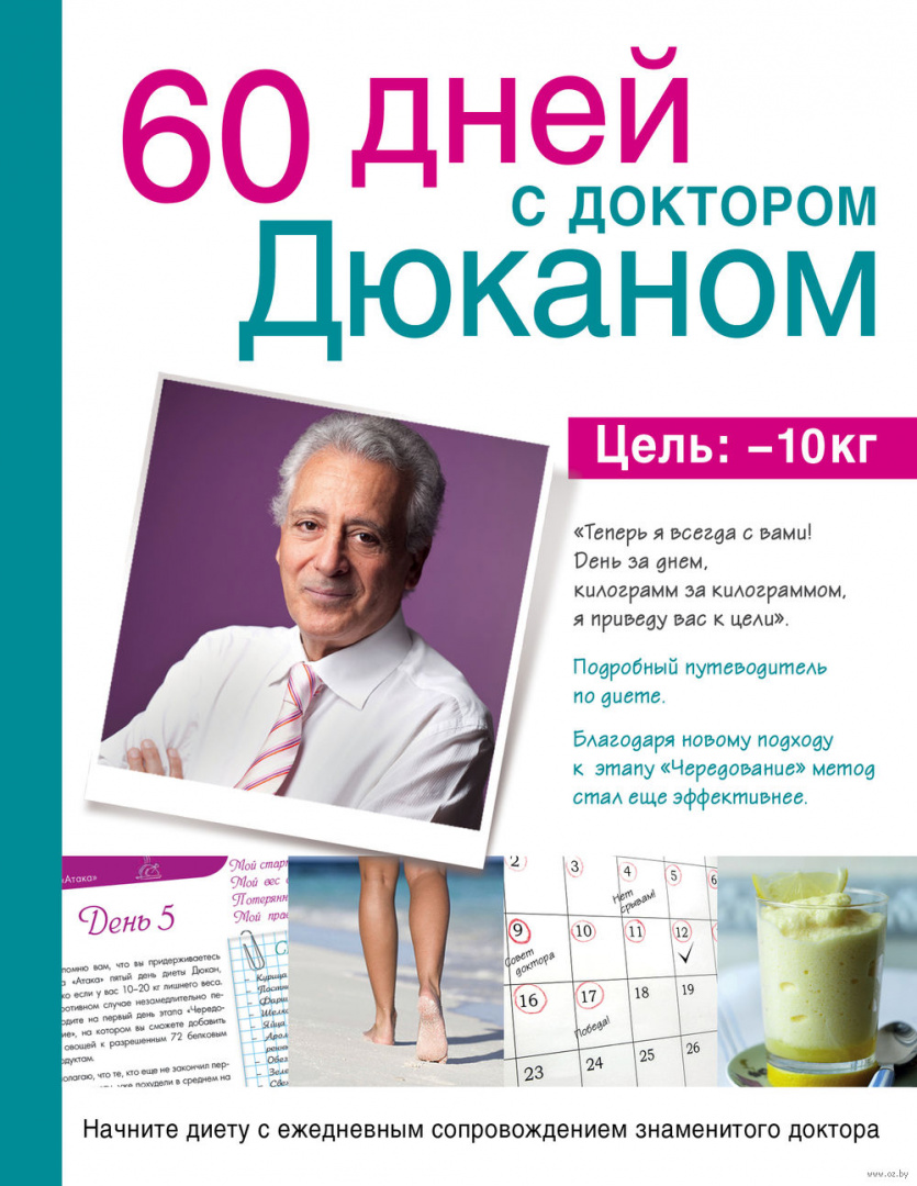 Новая книга доктора Пьера Дюкана обязательна для тех, кто хочет начать диету в сопровождении знаменитого французского диетолога. Вместе с ним вы будете идти к цели: избавиться от 10 килограммов за 60 дней. Это первое издание, которое создано для постоянного сопровождения худеющего. Каждый день, на протяжении двух месяцев, доктор будет поддерживать и направлять вас: давать советы по питанию, составлять списки покупок и варианты простой физической нагрузки, предлагать полезные рецепты и мотивирующие рекомендации для предотвращения срывов и нарушений. С таким наставником терять вес будет гораздо легче и эффективнее, чем самостоятельно продумывая свое меню и упражнения.