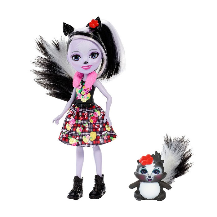 Самое время познакомиться со Скунси Седж и ее милым скунсом по имени Кейпер. Они так похожи! У Скунси есть ушки, хвостик и носик. А еще у нее фиолетовая кожа, серые глазки и длинные черные волосы с белыми прядками, которые можно расчёсывать. Наряд у Скунси просто очарователен: розовый воротник, черный топ с рисунком цветочков, пышная юбка в клетку с нарисованными нотками и цветочками. А на ножках героини красуются стильные черные ботинки. У Кейпера милая мордочка, лапки и ушки, большие глазки, пушистый хвостик, а на голове красный цветочек. Ваша маленькая принцесса будет в восторге от этого набора, ведь с ним можно придумать так много увлекательных историй для веселой игры.
