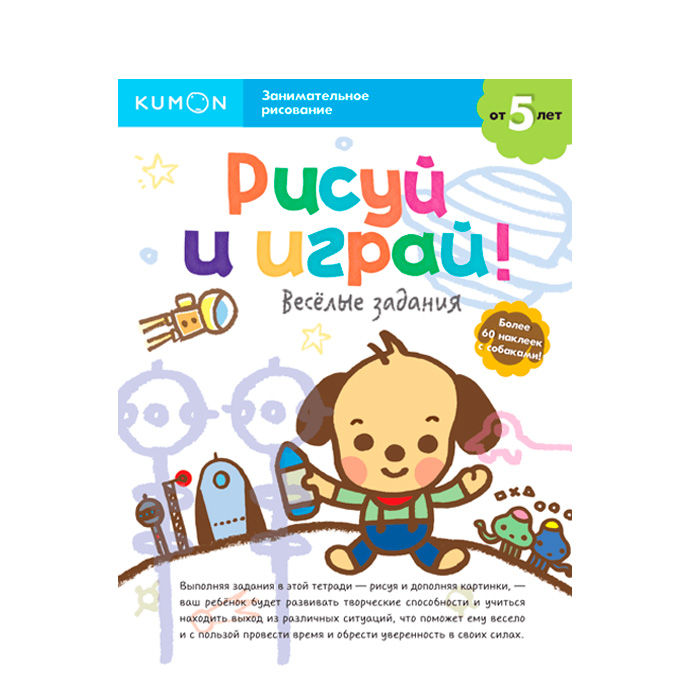 Серия «Kumon. Занимательное рисование» состоит из двух тетрадей и поэтапно помогает развить креативное мышление. Тетради зеркально повторяют друга друга по темам и видам заданий. Меняются только картинки, с которыми нужно работать, а также наклейки для мотивации ребенка (в одной тетради кошки, в другой — собаки).